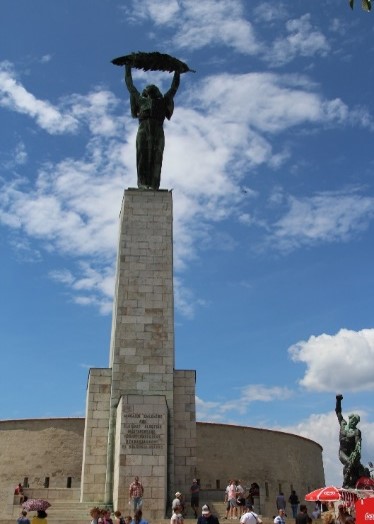 Dojście zajmuje nam jakieś 40-50 min. z przystankami i podziwianiem. A na samej górze? Jest pomnik wolności- figura kobiety unoszącej liść palmowy widoczna na cały Budapeszt. Dawniej u stóp kobiety stał radziecki żołnierz ze sztandarem w dłoni. Pomnik nosił wtedy nazwę Pomnika Wyzwolenia. A po upadku komunizmu nie bardzo było wiadomo, co z tym fantem zrobić i figura żołnierza została przewieziona do skansenu pomników komunistycznych. A kobita ostała się na miejscu.