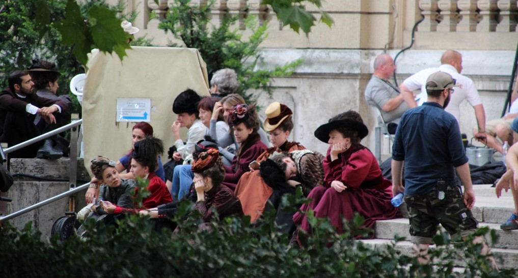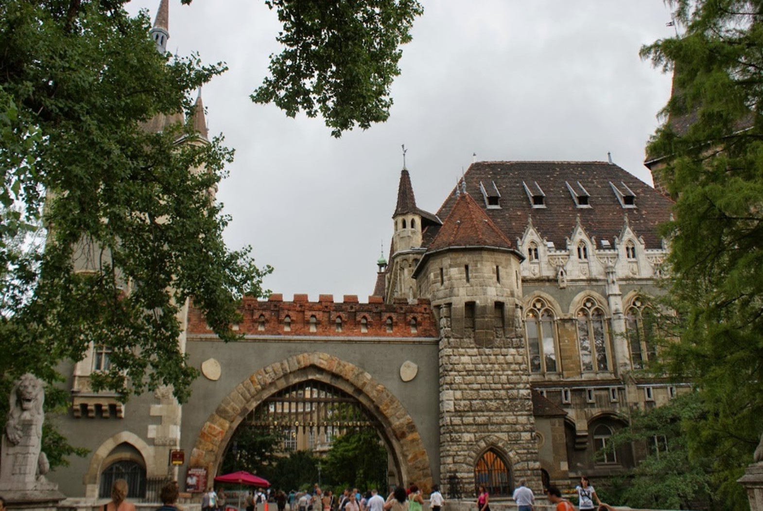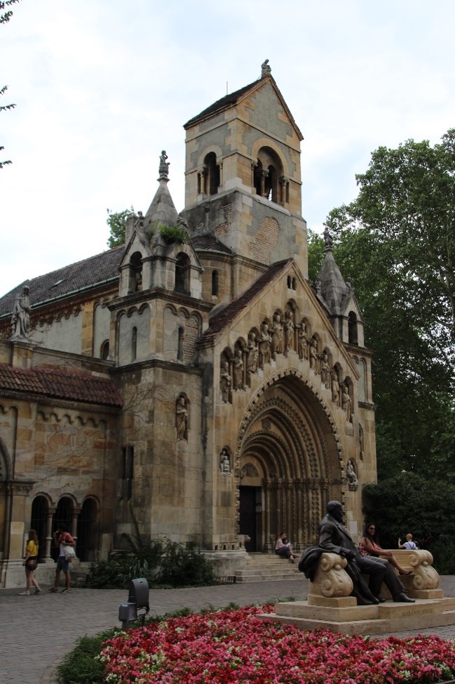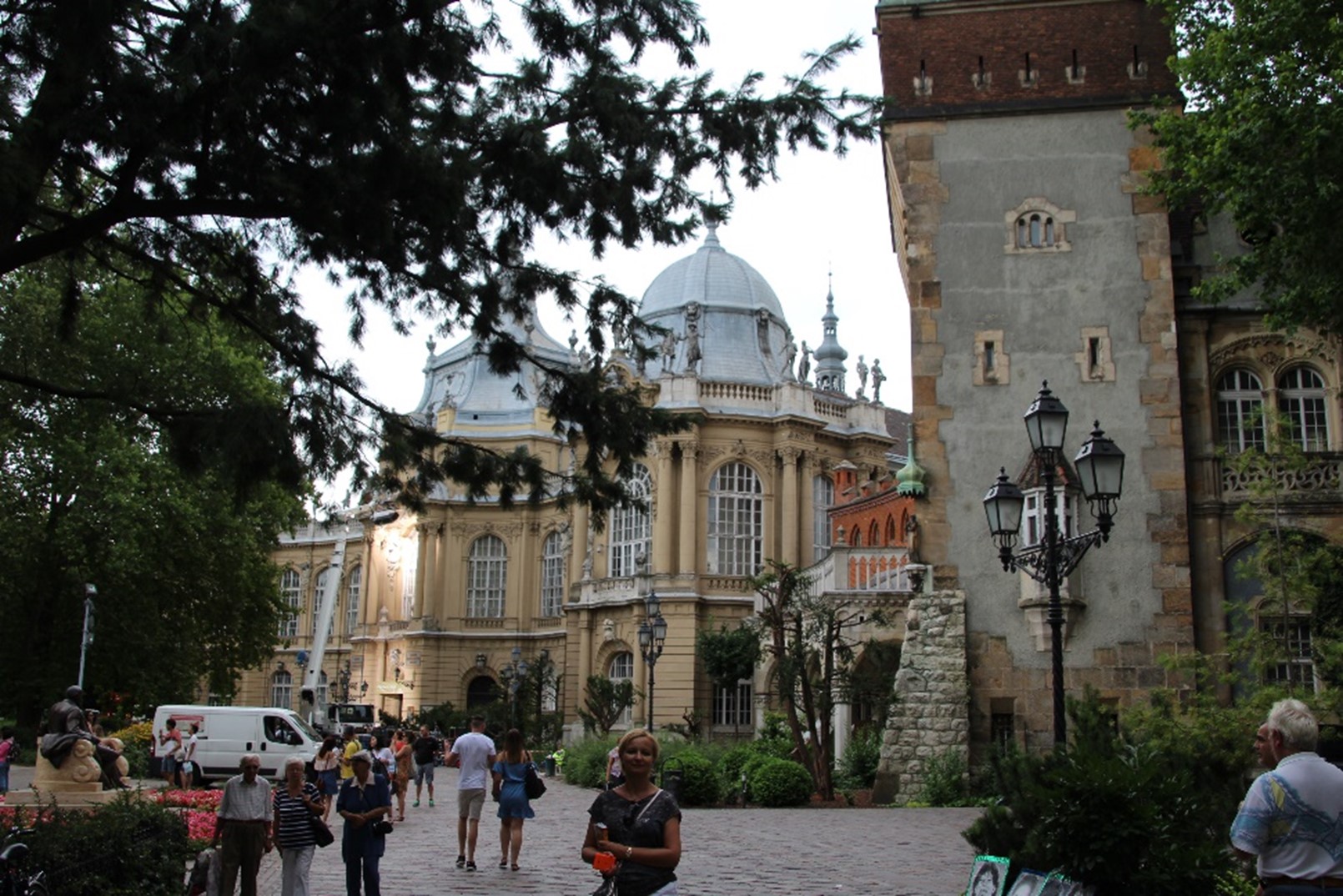 Idziemy dalej w stronę zamku Vajahunyad. Koło zamku siedzi podobno kronikarz Anonim trzymający w ręce pióro, którego dotknięcie ma pozytywnie wpływać na rozwój talentów literackich. W zamyśle mam opisanie naszego wypadu do Budapesztu, więc natchnienie mi potrzebne. Wiem już, że poszukać go muszę… I człowiek głupieje, bo wcale się nie spodziewał połączenia takich stylów w jednej budowli. A najlepsze jest, że w tym cudownym budynku za mną mieści się Muzeum Rolnictwa. Miejsce sobie niezłe wybrali. Dookoła fajny kompleks parkowy ze stawkiem i muzyką na żywo. Klimatycznie, tym bardziej, że właśnie kręcą tam film kostiumowy. Przystajemy, żeby popatrzeć na zmęczone już trochę aktorki.
