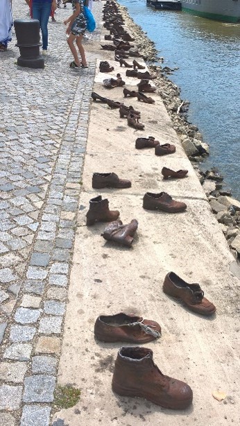 Jakieś 300 metrów od Parlamentu natrafiamy na smutne wspomnienie historii Żydów w Budapeszcie. Podobno naziści codzienne ustawiali ok. 50-60 Żydów na nadbrzeżu przodem do Dunaju i zabijali ich strzałem w plecy. Wcześniej jednak kazali im zdejmować obuwie i pozostawić na brzegu rzeki. Dla upamiętnienia tych tragicznych wydarzeń odlano z żelaza 60 par butów, żeby choć przez chwilę przystanąć i pomyśleć o tym, co na szczęście już za nami.