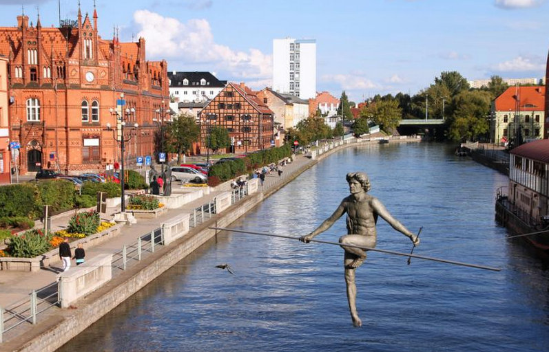 BYDGOSZCZ- wcale nie zamierzam opisywać zabytków. Informacja turystyczna na Starym Rynku jest cudowna i od razu przyjmują cię tam jak swojego. Zamierzam opisać to, co na nas zrobiło największe wrażenie. Po pierwsze potencjał tego miasta- może i dużo jeszcze do zrobienia, ale to, co nas wita, czyli spichrze nad Brdą z „Przechodzącym przez rzekę” ku czci naszego wejścia do Unii, już pozwala się sobą zauroczyć. Wyspa Młyńska- otoczona kanałami oaza zieleni, knajpek i różnych takich innych lokali smakowych- rewelacja. Taka nasza polska Wenecja. Wszystko inne na dłuższy spacer- no bardzo, bardzo… A na wieczorne posiedzenie przy winku- lokali aż przepych. Szkoda tylko, że Pan Twardowski w tym oknie na rynku taki niewykorzystany. Przecież tam jest cała legenda, którą mógłby opowiadać…