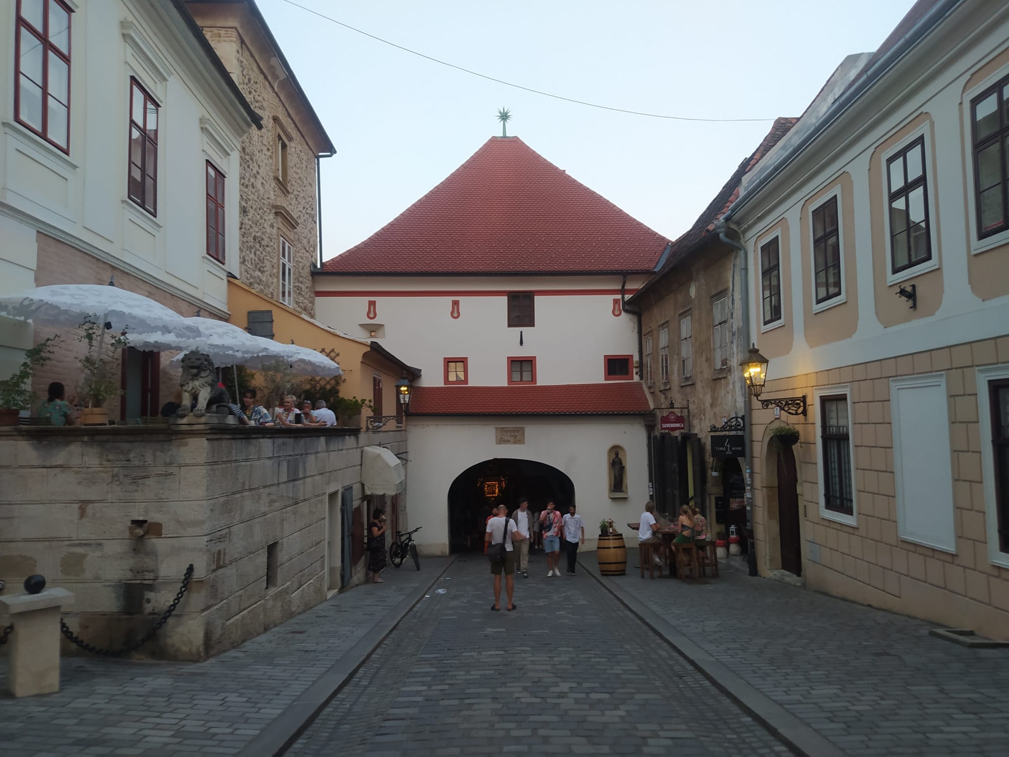 A na górze jeszcze koniecznie trzeba pójść do Kamiennej Bramy. To jedyna brama, która zachowała się z oryginalnych murów miasta z XIII wieku. Jeden z najstarszych zabytków w Zagrzebiu. W przejściu bramy znajduje się mała kapliczka z obrazem Matki Bożej z Kamiennej Bramy. Obok ławki z klęcznikiem i mieszkańcy modlący się i zapalający świeczki w swoich intencjach.