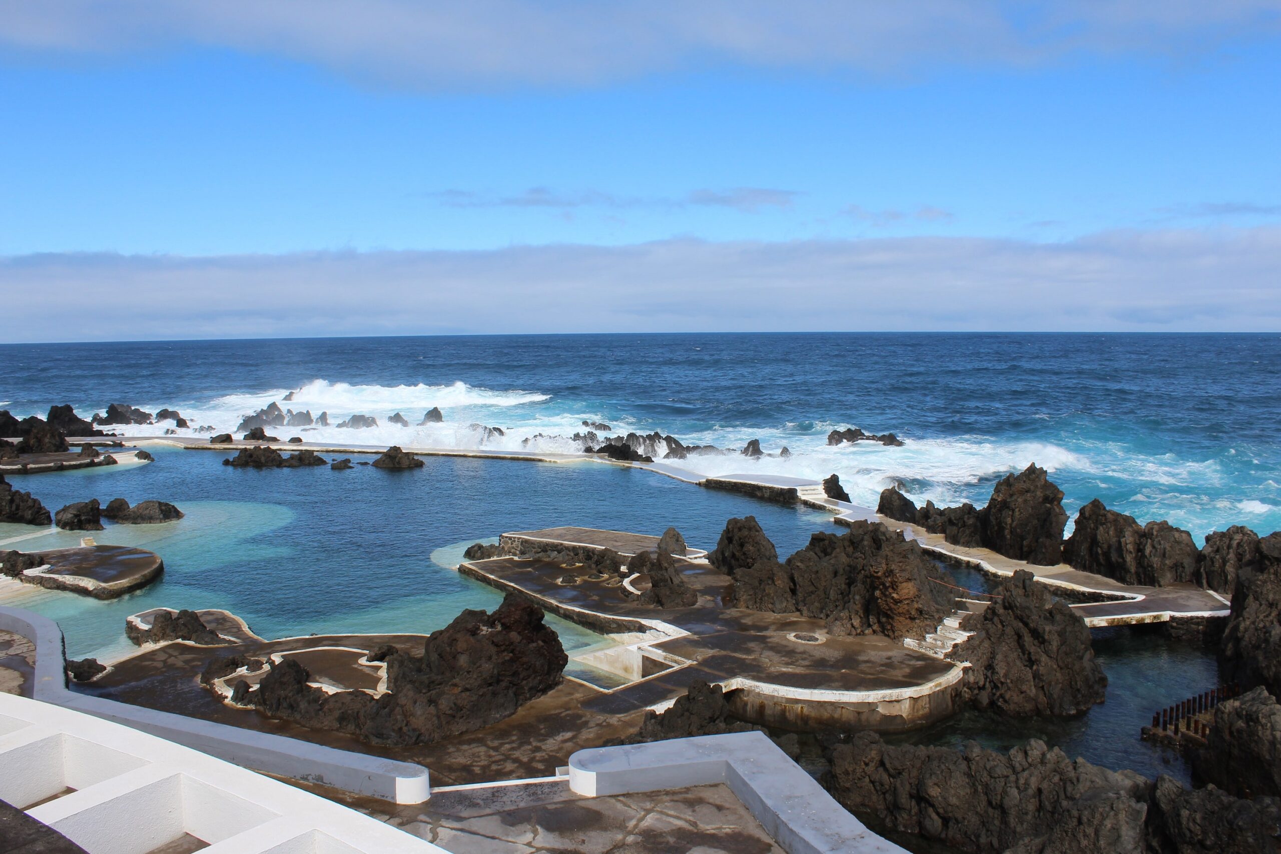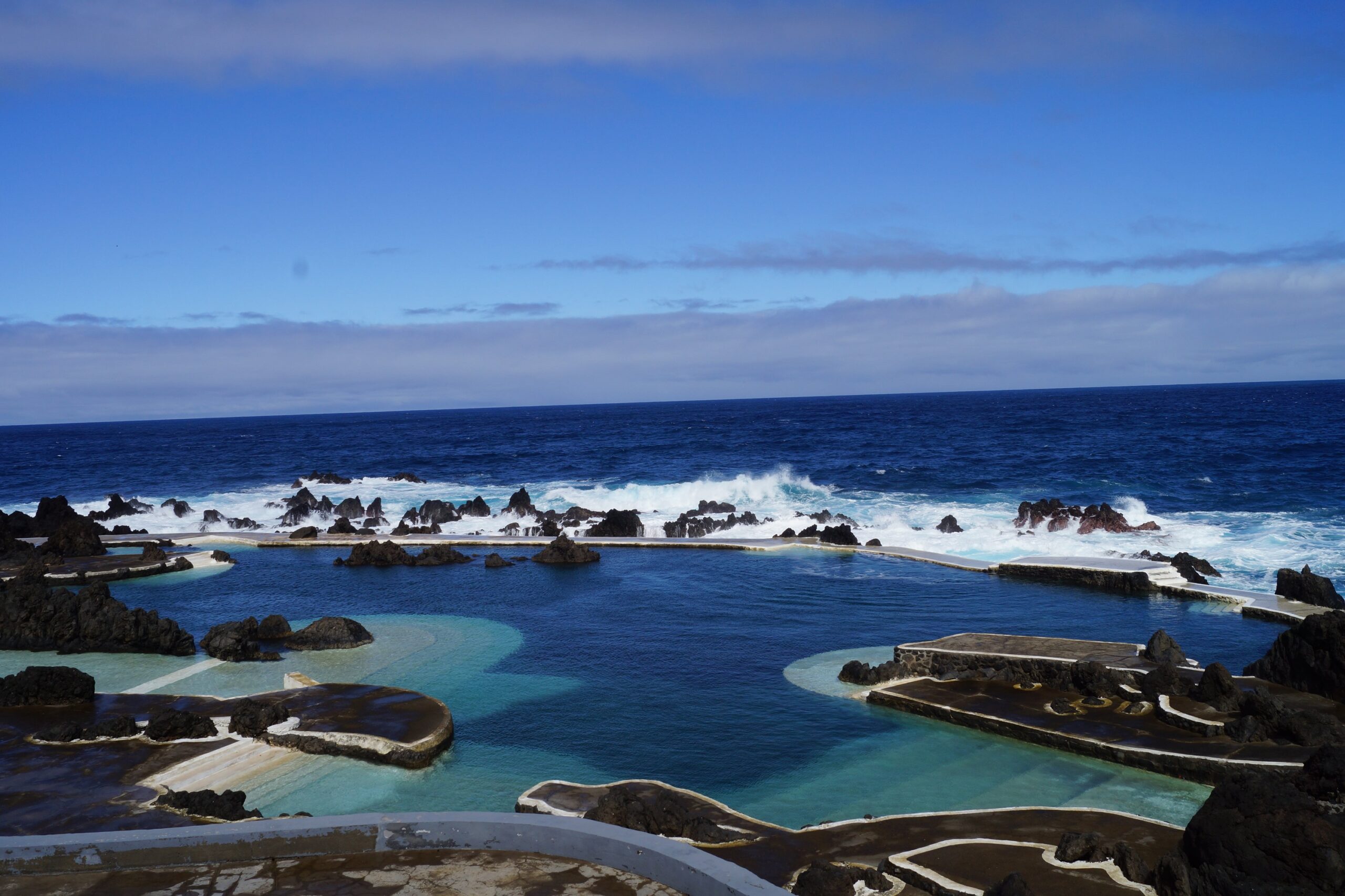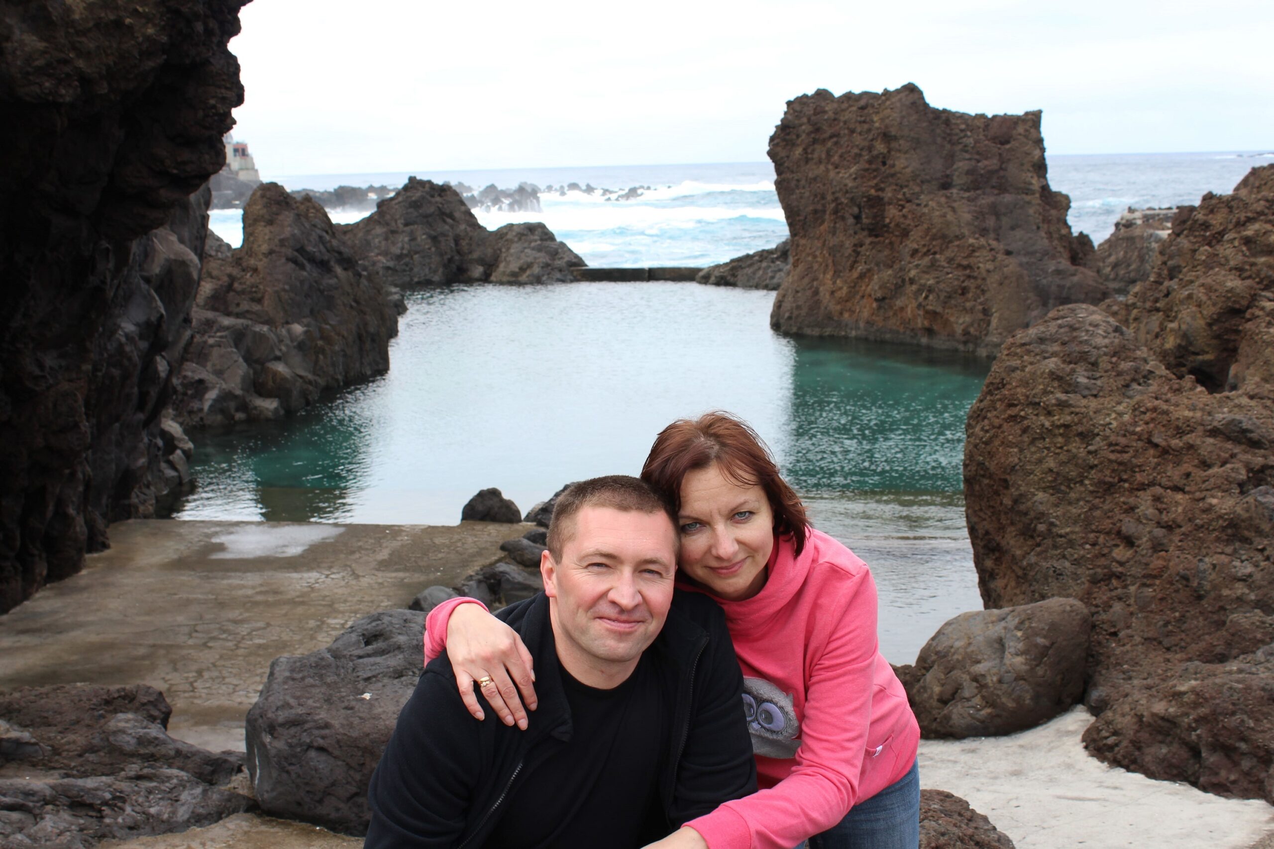 Takim zwykłym, najzwyklejszym autobusem jedziemy sobie na drugą stronę wyspy. Piękna to wyprawa, bo nie trzeba się koncentrować na drodze, ale jednak nie da rady nie koncentrować się na krajobrazach, które mijamy. Autobus robi sobie przerwę w widokowych miejscach, więc jest czas, żeby popatrzeć bardziej. Porto Moniz znane jest z tego, że znajdują się tam naturalne baseny skalne. Ukształtowała je lawa, która zastygła w zimnej wodzie oceanicznej. I wygląda to przepięknie. Wieje, ale nic to. Niektórzy z naszych wycieczkowiczów nawet zażywają kąpieli.