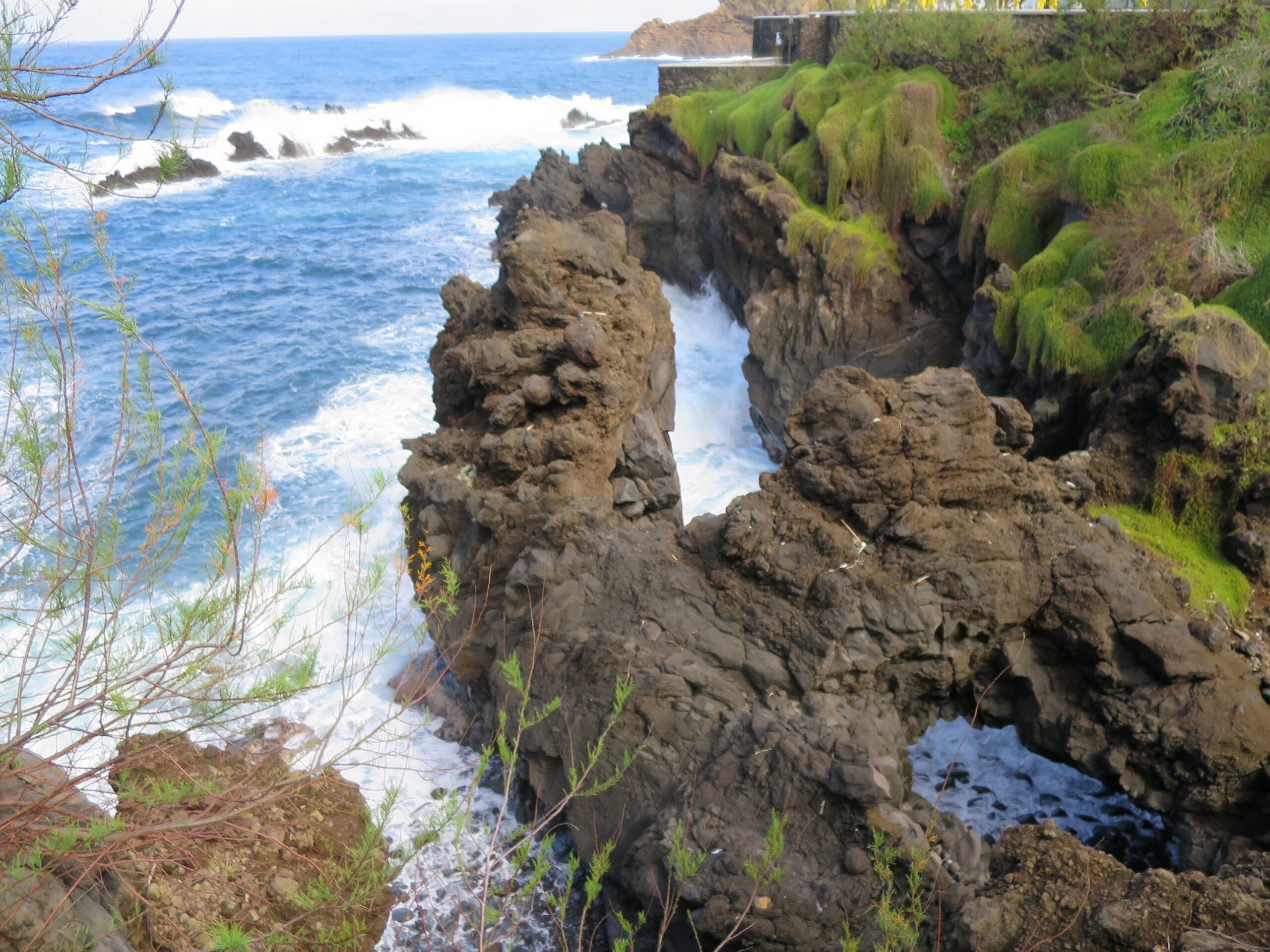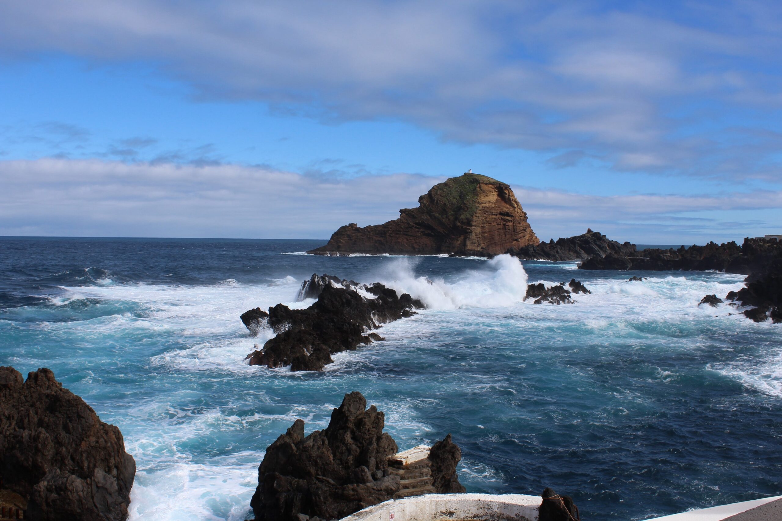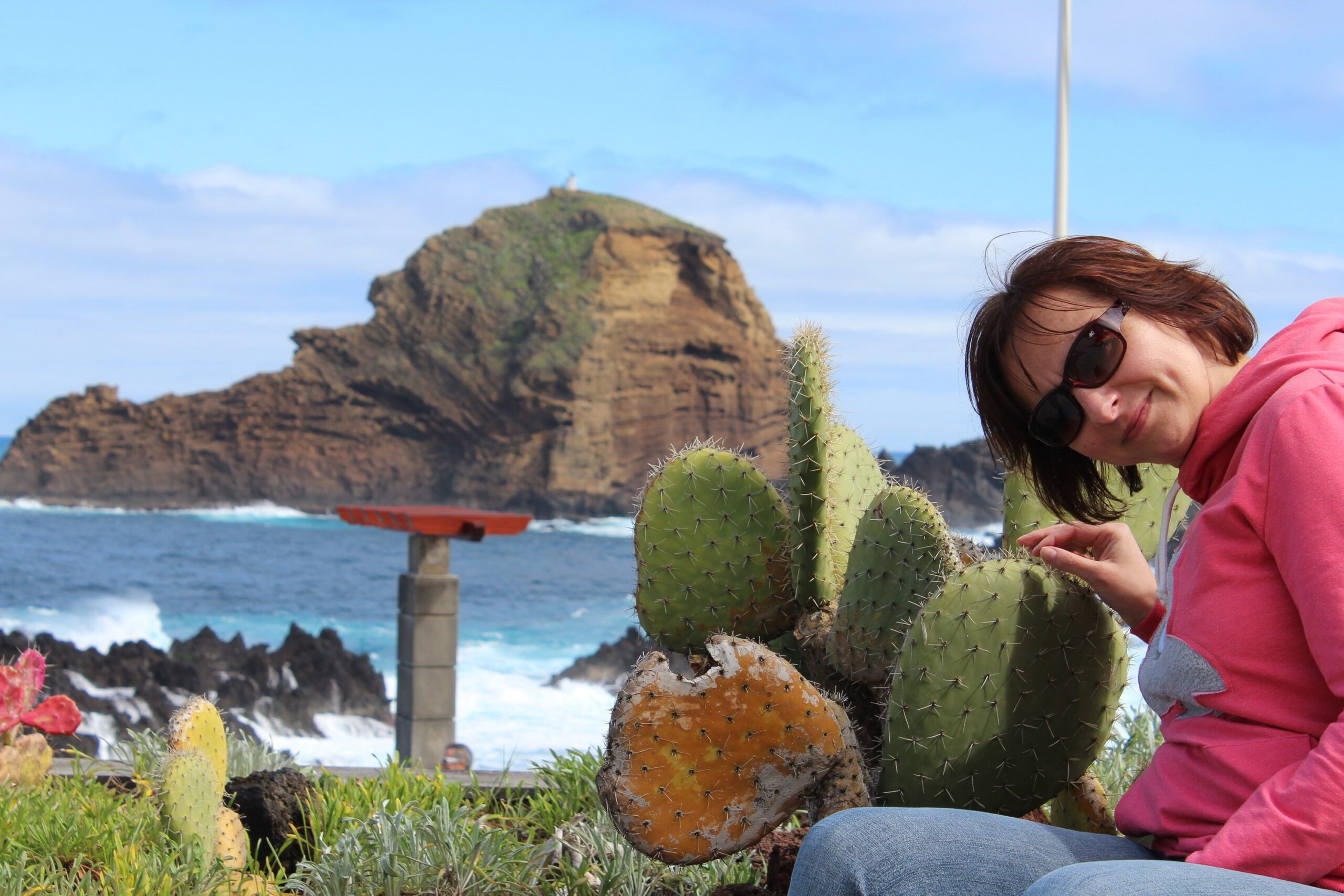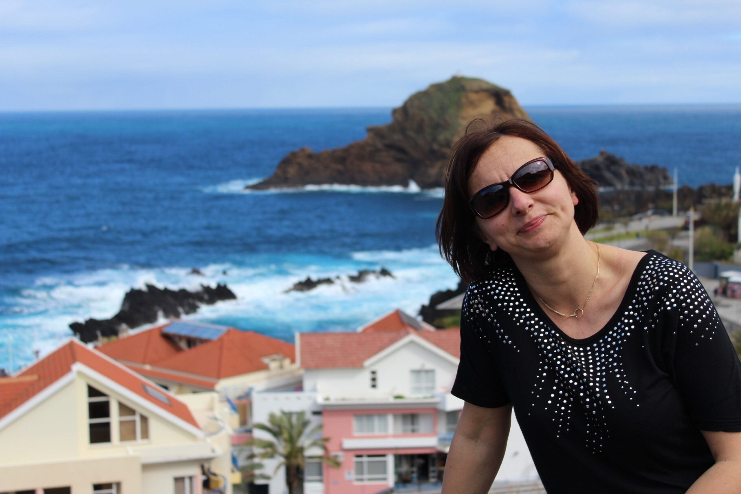 Takim zwykłym, najzwyklejszym autobusem jedziemy sobie na drugą stronę wyspy. Piękna to wyprawa, bo nie trzeba się koncentrować na drodze, ale jednak nie da rady nie koncentrować się na krajobrazach, które mijamy. Autobus robi sobie przerwę w widokowych miejscach, więc jest czas, żeby popatrzeć bardziej. Porto Moniz znane jest z tego, że znajdują się tam naturalne baseny skalne. Ukształtowała je lawa, która zastygła w zimnej wodzie oceanicznej. I wygląda to przepięknie. Wieje, ale nic to. Niektórzy z naszych wycieczkowiczów nawet zażywają kąpieli.