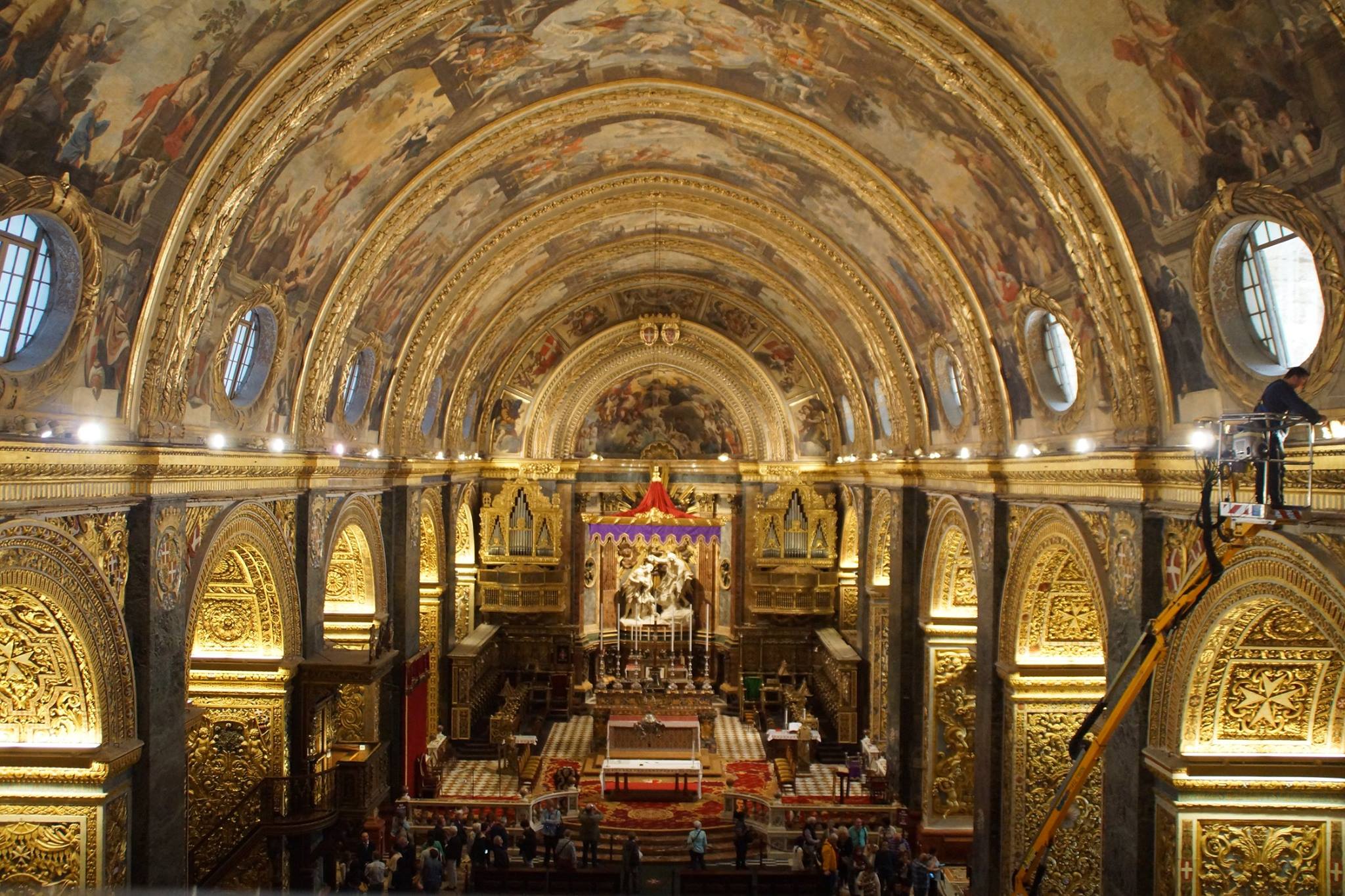 Ale oprócz chodzenia po ulicy chcemy też odkryć to, co w Vallecie najcenniejsze. Nie wyobrażam sobie, żeby będąc tam nie wejść do Kontrkatedry Świętego Jana. A z zewnątrz jest tak niepozorna, że wchodzisz człowieku do środka i stoisz osłupiały. Gdzie nie spojrzysz tam arcydzieło. Każdy fragment pokryty misternymi zdobieniami. Są wszędzie- na sklepieniu, na ścianach, na kolumnach, na portalach. Nawet posadzka jest dziełem sztuki, a stąpanie po niej może wywoływać mieszane uczucia. Bo chodzimy po 375 płytach nagrobnych upamiętniające wyśmienitości zakonu rycerskiego.