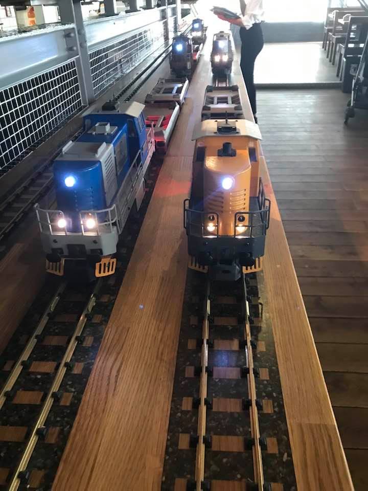 I to jest hit, myślę, że nie tylko dla dzieci. Bo my też dobrze tam bawiliśmy się. Trafiamy bowiem do miejsca, w którym na całej powierzchni rozłożone są tory kolejowe łączące każdy stolik z barem. Zamówienie przywożone jest więc przez lokomotywę na doczepionych wagonikach do konkretnego stolika. I kilkanaście takich lokomotyw sobie kursuje ciągle, bo przyjeżdżają również po puste szklanki i pojemniki po jedzeniu. No i zabawa była przednia, a młodzież powiedziała, że właśnie to najbardziej zapamięta z Pragi- ot i cały mój pozostały wysiłek poszedł na marne haha.