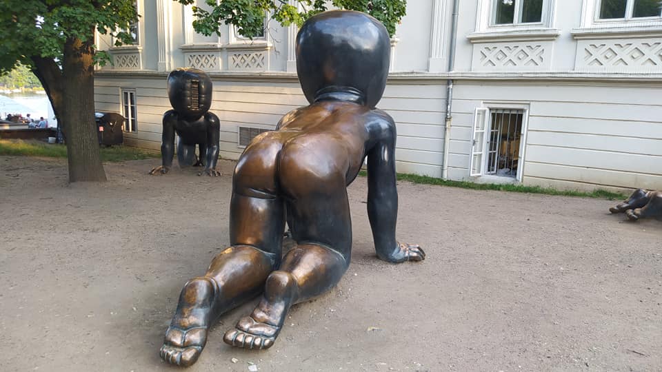 Tutaj- dodam od razu- było najwięcej „Wow, ale fajne”, „Ale to głupie”, „Ale o co mu w ogóle chodzi?”. Jeżeli autorowi chodziło to, żeby nie pozostać obojętnym, co cel swój osiągnął z pewnością. Jego rzeźby rozsiane są w różnych miejscach Pragi. Nam udało się zobaczyć cztery z nich: