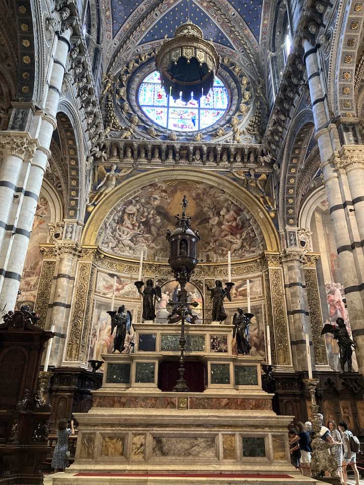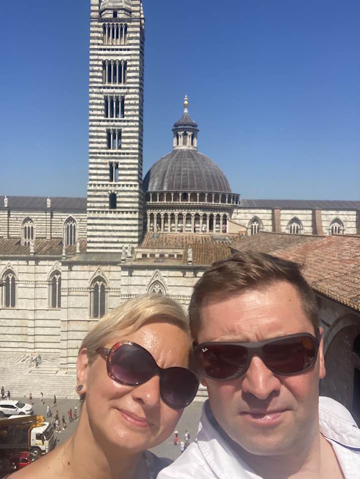 Dobra. Contrady, il Campo i palio mamy już w miarę opanowane. Pozostał nam niewątpliwy piękny symbol Sieny- katedra. Jedna z najpiękniejszych we Włoszech. Stara, staruteńka, bo z XIV wieku. Upał niemiłosierny, podobnie jak kolejka. Bilet jaki kupujemy uprawnia nas do wejścia do katedry, biblioteki, baptysterium, oratorium, krypty i punktu widokowego.