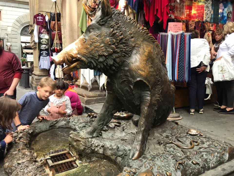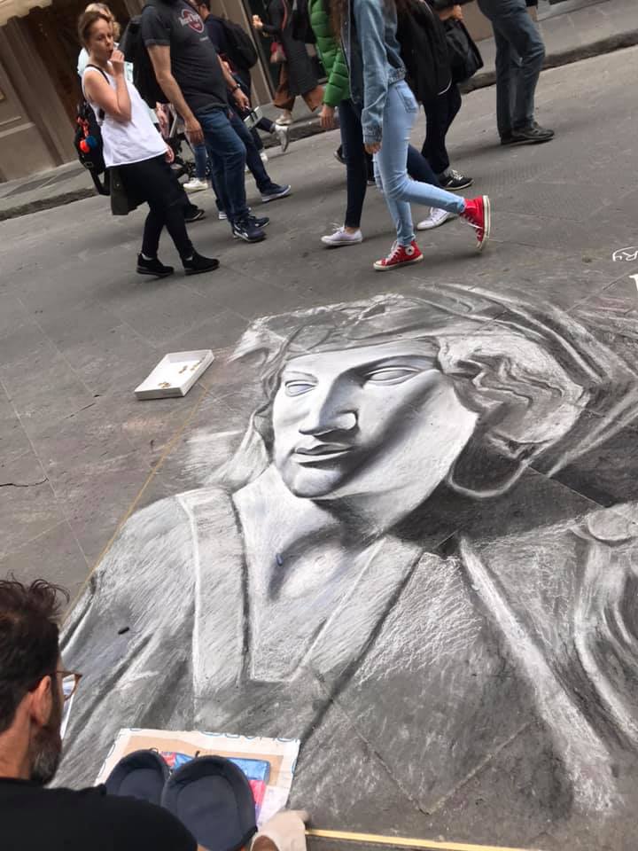 Po krótkiej przerwie udajemy się do słynnego dzika Porcellino, którego trzeba pogłaskać w ryjek, żeby wrócić do Florencji. Albo mieć szczęście. Interpretacji mnóstwo. Widzieliście Mona Lisę malowaną na asfalcie? Niedaleko Porcellino natrafiamy na miejsce, gdzie obrazy tworzą się na żywo. Przystajemy oczarowani.