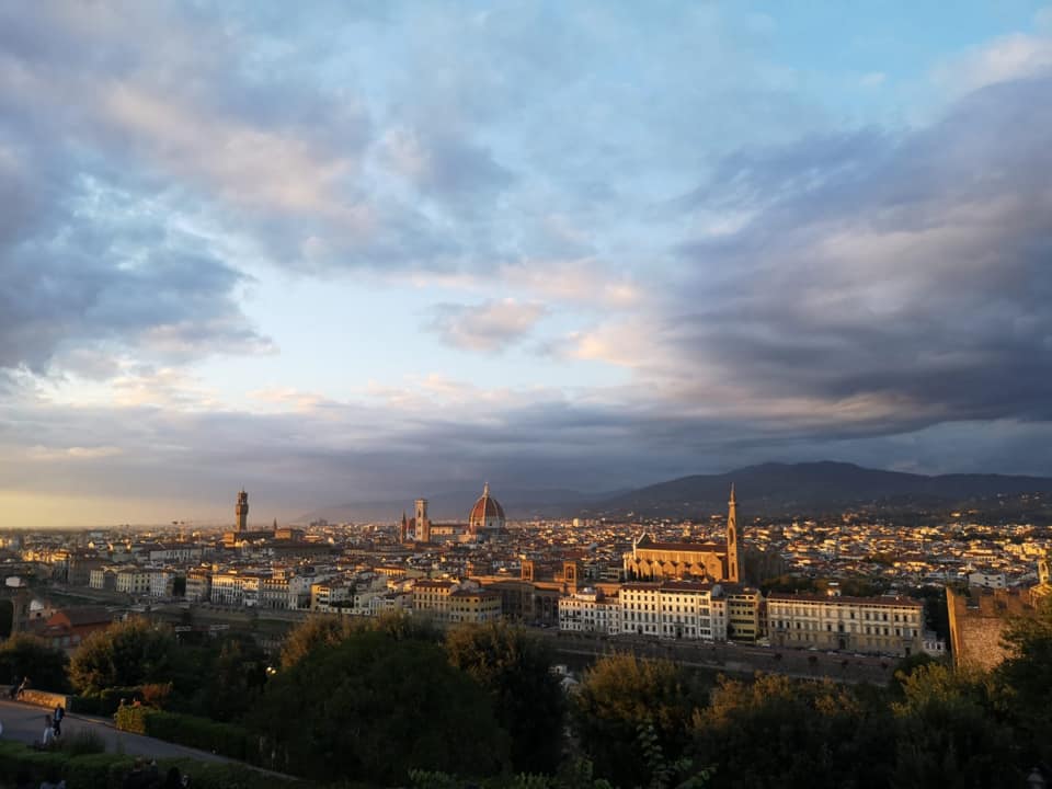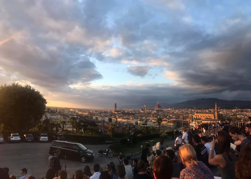 Słońce jeszcze walczy, ale za chwilę będzie chyliło się ku zachodowi. Postanawiamy przeżyć ten moment w najlepszym miejscu do podziwiania panoramy zabytkowej Florencji- Piazzale Michelangelo- Plac Michała Anioła. Kupujemy pizzę i z winkiem i kubeczkami (w każdym barze mają przygotowane haha) wspinamy się na wzgórze. Tłumy turystów też z winkiem, muzycy, stragany i powalający widok na Florencję. „Chwilo trwaj!”- ciśnie nam się na usta.