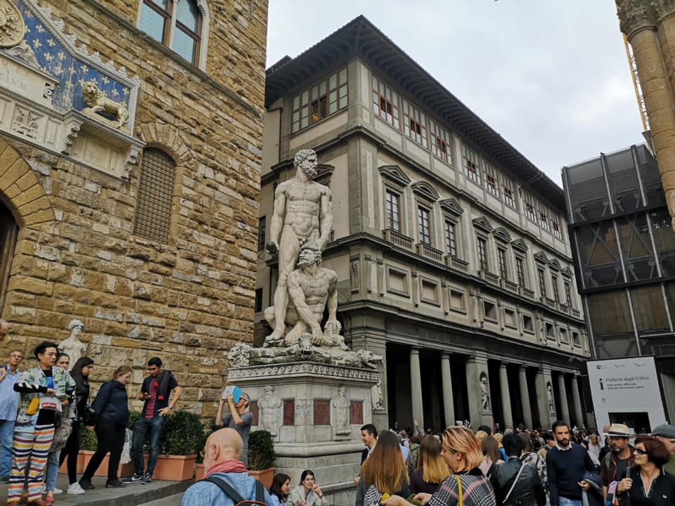 My nie wchodzimy- ruszamy dalej. Przed nami Piazza della Signoria- Plac Pomników- najważniejszy plac w mieście, otoczony licznymi pałacami i zdobiony rzeźbami. To tutaj stoi dzieło „Dawid” Michała Anioła, a właściwie jego kopia. Analizujemy każdy szczegół anatomiczny Dawida. Nie będę cytowała wypowiedzi przez szacunek ogromny do czytających haha.