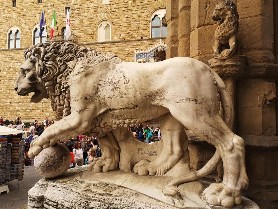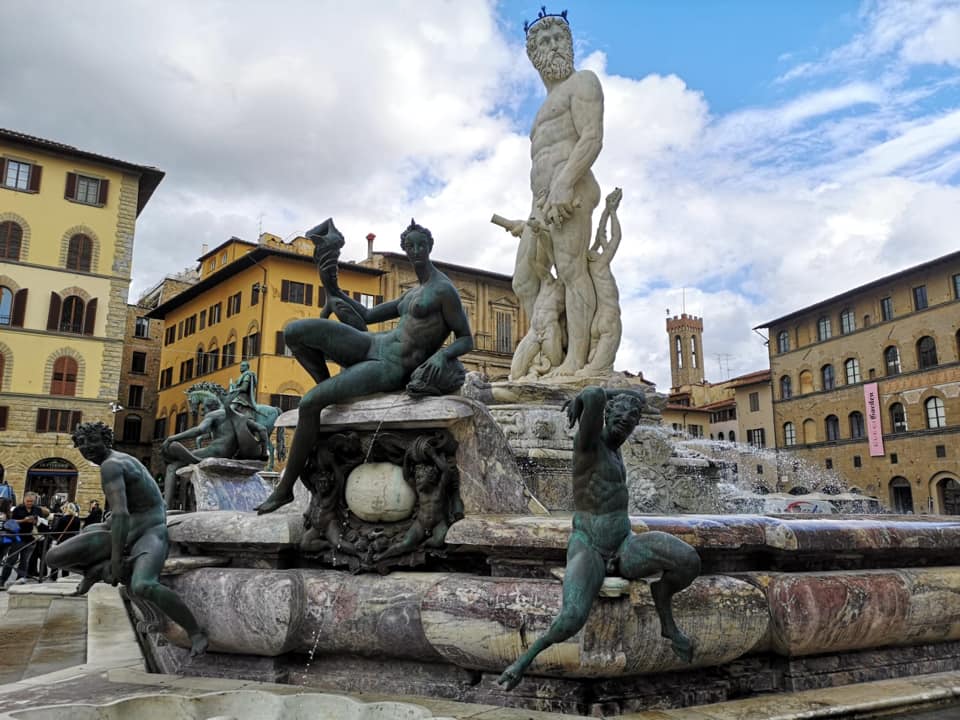 Najważniejszą i najbardziej charakterystyczną budowlą na placu jest Palazzo Vecchio- Stary Pałac- trzy kondygnacje i wysoka na ponad 90 metrów wieża z tarasem. Obok Starego Pałacu oglądamy Fontannę Neptuna, a już za chwilę dużo, dużo więcej pomników. Natchnieni i uduchowieni stwierdzamy, że oto nastał czas na kawę w tak urokliwych okolicznościach przyrody.