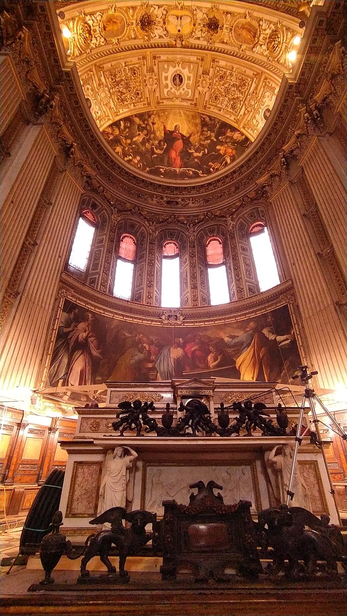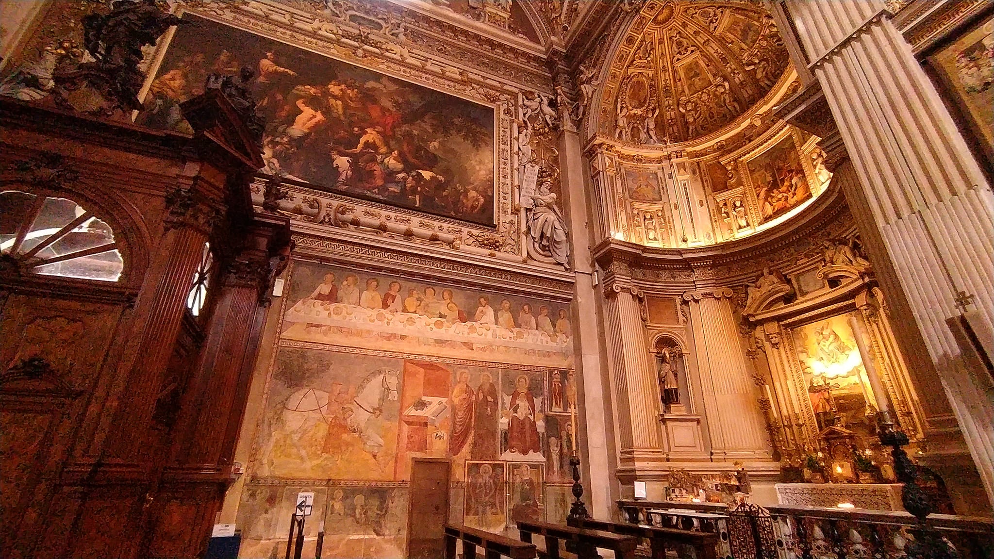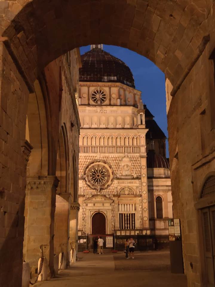 A stare miasto Citta Alta to już inna bajka. W takich miejscach najczęściej stoją kościoły w liczbie mnogiej. Tak jest i tutaj. Wrażenie największe robi wewnątrz jednak Bazylika Santa Maria Maggiore wybudowana przez mieszkańców w podzięce, że uchroniła te tereny przed klęskami wszelakimi. Wchodzimy do niej przez Portal Czerwonych Lwów. Przepiękne barokowe wnętrze, bajecznie kolorowe freski, arrasy. Tak sobie przycupnąć po prostu choćby na 20 min. – rarytas.