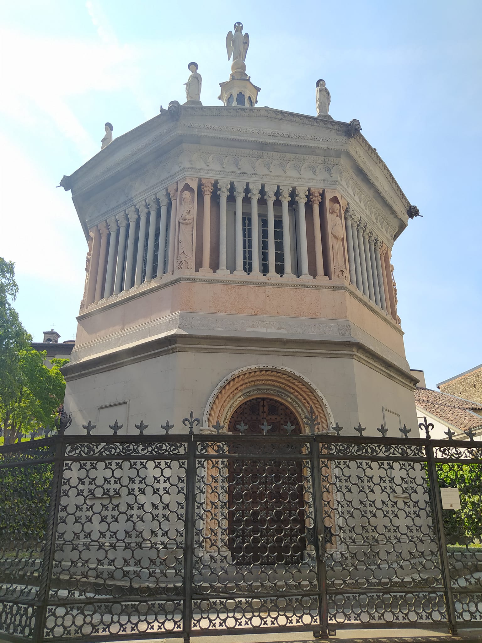 Tuż obok stoi kolejna perełka- Kaplica Colleoni (Cappella Colleoni) pełniąca rolę mauzoleum. Nie znam się jakoś specjalnie na sztuce, ale ten renesans włoski kurcze no robi wrażenie. Jednak w takich miejscach i tak najbardziej na wszystkich działają legendy. Renesans staje się bardziej renesansowy wtedy. No a tu trzeba szukać trzech jąder. Niejaki Calleoni je miał. Nie wiem czy się szczycił tym czy nie, ale symbol sobie po nich kazał umieścić i w kościele i w bramie. I tak wszystkie po kolei te jądra dotykają. Z uśmiechem i rozczarowaniem, że małe to takie…., ale i wielką wiarą, że i kredyt może uda się szybciej spłacić i w to miejsce magiczne wrócić. Podobno jak się pociera, to i marzenia się spełniają haha.