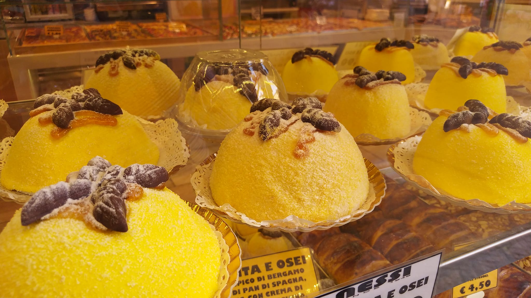 A potem jeszcze lody, koniecznie te nakładane packami i jak dla mnie tylko pistacjowe. I gapy wszystkie nie dałyśmy rady wcisnąć już polenty. A przecież to przysmak z Bergamo największy. Wytwarzana z biszkoptu, kremu czekoladowego, masła i orzechów laskowych z dodatkiem rumu. Biszkopt pokryty jest marcepanem i starannie posypany żółtym cukrem. Całość wygląda jak kopa siana, na której przysiadł marcepanowy ptaszek pokryty czekoladą. Dobrze, że chociaż na zdjęciu ją mamy…