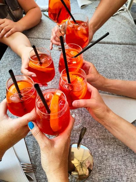 A potem już tylko uczta dla ciała- iście włoska kolacja z Aperolem, bo przecież radosne bycie razem w takich okolicznościach przyrody uczcić trzeba  i późny powrót do domu (a w pociągu- „czółko”, czyli takie kalambury na skojarzenia, ale i na śpiewanie). Przechodzący Włoch widząc i słysząc nas mówi: „Jestem w niebie” haha. Tak w zasadzie, to i my trochę chyba się do niego, tego nieba w sensie, zbliżyłyśmy tego dnia. Werona kupiła nas. Oj kupiła! To był piękny dzień:)
