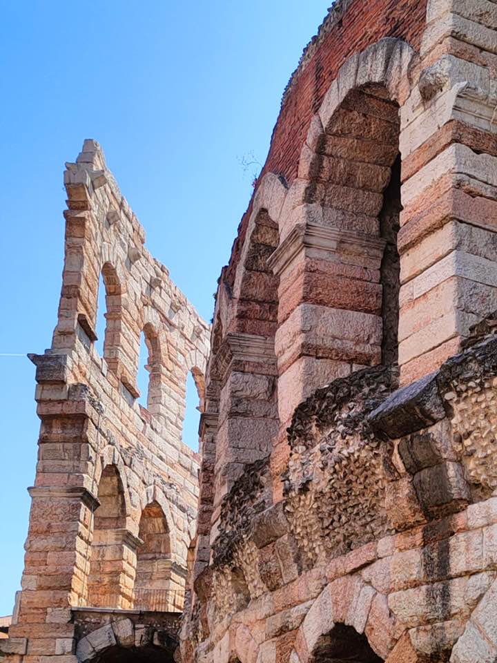 Werona nie od razu cała się odkrywa. Najpierw czeka nas spacerek- niestety ruchliwą ulicą, tak z 20 min. A  potem już przepadamy. Z jednej strony niefajnie, bo tłumy turystów. I nie wiem, jak wygląda to miasto w okresie wysokoturystycznym, ale przy piątku z rana już jest całkiem tłoczno. Ale za to z drugiej strony- czyste piękno. Piękno na każdym kroku. Najpierw trafiasz na Plac Bra. To ten plac z symbolem miasta, czyli rzymskim amfiteatrem z I w. n.e.  i przy okazji trzecim największym we Włoszech. Udaje nam się przycupnąć w jego cieniu na schodkach i poczytać trochę na temat tych starożytnych murów. I tak jakoś masz wrażenie człowieku, że opierając się o te mury tak jakoś głębiej oddychasz…