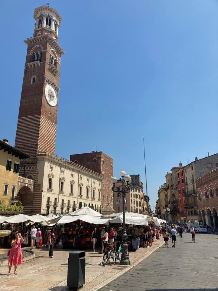 A my powolutku przemieszczamy się na Piazza della Erbe- drugi piękny plac, tym razem jest to Plac Ziół. I na pewno jest on ładny, te budynki, fontanna, freski, balkony…. Ale na środku kupa chińszczyzny na kramach. Podobno można kupić tu najlepsze pamiątki. Kramy już i tak ujednolicone, ale ludzi w brud. Nie dostrzegasz tego piękna, chyba, że głowę do góry podniesiesz. Pięknie staje się tu chyba dopiero wieczorem, kiedy kramikarze zamkną swoje dobytki.